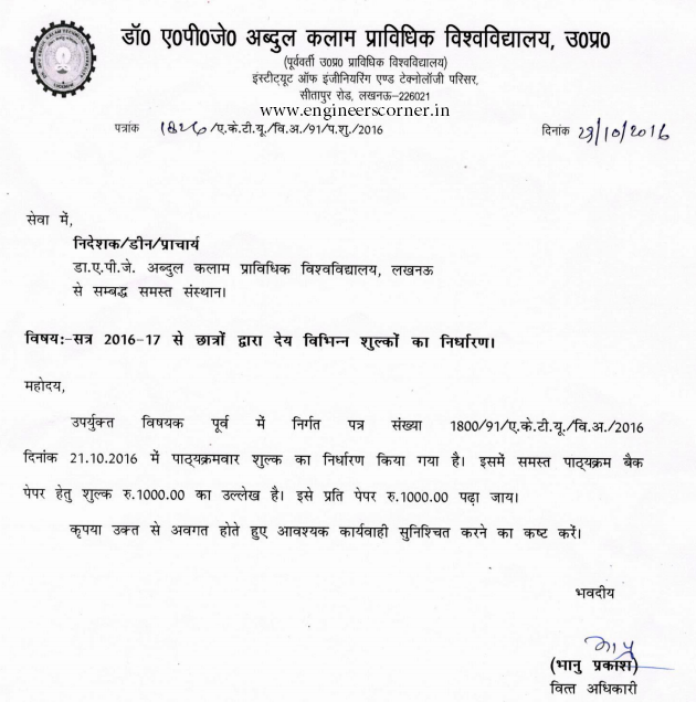 This is to inform you all the students of Dr. APJ Abdul Kalam Technical University (AKTU) has increased the carry over exam fee to Rs 1000 per subject. This circular was released by AKTU on 21st Oct 2016. Earlier the carry over exam fee used to be Rs 500 then it increased to Rs 750 which already started picking pockets of students to manage the extra increased amount of Rs 750 for carry over exam per subject. Now, the AKTU came up with a revised circular that from session 2016-17 students need to pay Rs 1000 per subject for carry over exam.