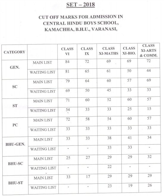 SET 2018 CUT OF MARKS FOR ADMISSION IN CENTRAL HINDU BOYS SCHOOL KAMACHHA VARANASI