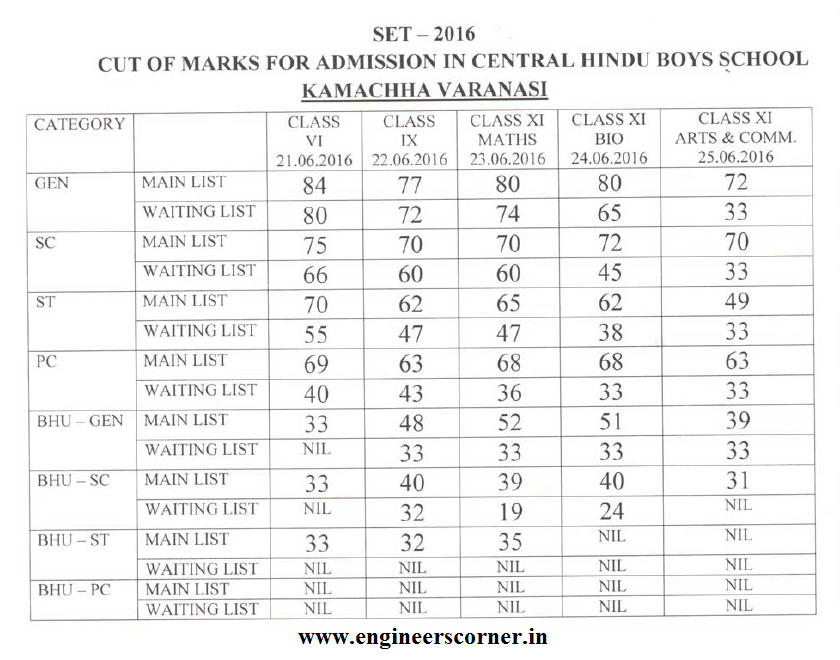 SET 2016 CUT OF MARKS FOR ADMISSION IN CENTRAL HINDU BOYS SCHOOL KAMACHHA VARANASI