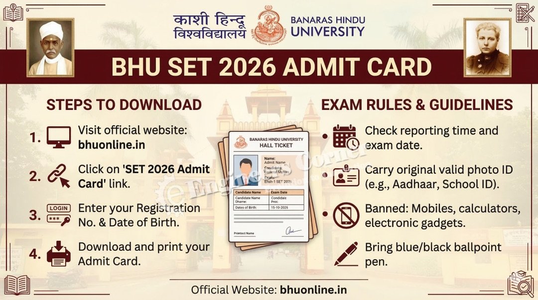 BHU SET 2026 candidates, the wait is over. The admit card for BHU SET 2026 is now available for download from 11 April 2026 on the official portal bhuonline.in. If you applied for SET 2026, download your admit card today. Entry to the exam hall will not be allowed without it, as clearly stated in the official bulletin.