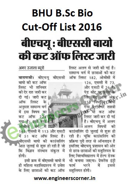 Below is the complete list of BHU B.Sc Cut off list 2016 for all male & female candidates. The Cutoff marks list of BHU B.Sc Maths, B.Ed, B.Com, B.A. Arts, B.A., B.A LLB, B.A. (Hons) Social Science, B.Sc (Ag) cutoff marks list will be announced very soon on this website engineerscorner.in or bhuonline.in