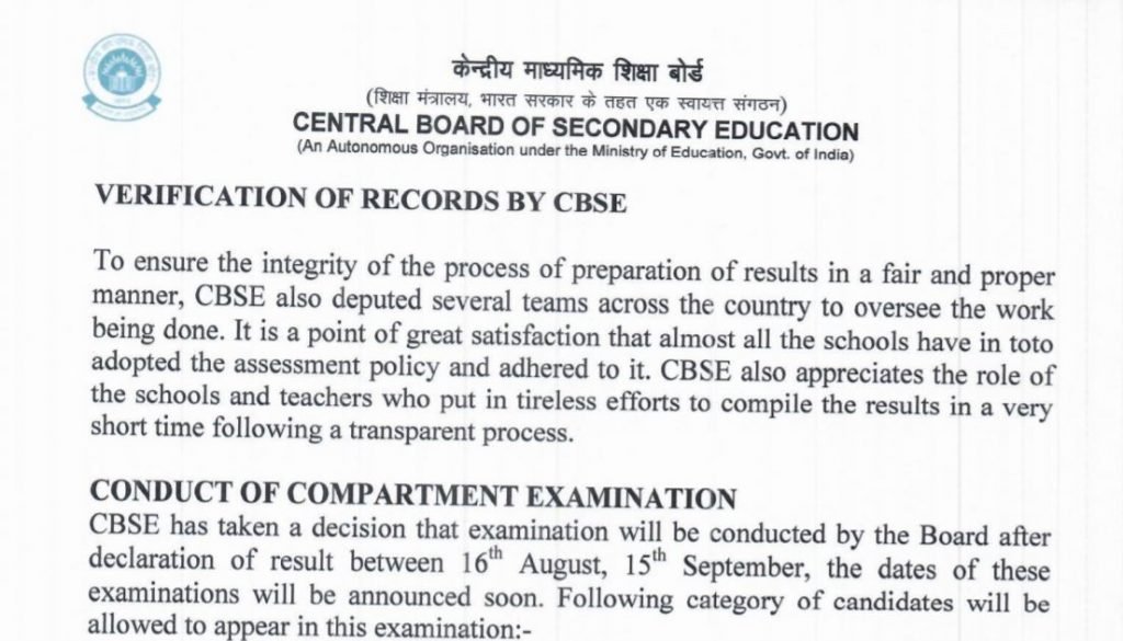 Date of Compartment Exam – 16th August to 15th September 2021.