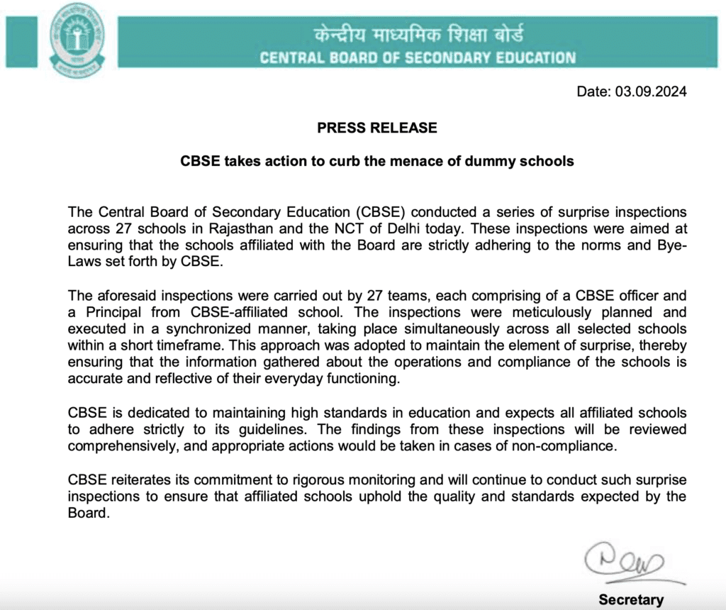 The Central Board of Secondary Education (CBSE) took strong action today to address the issue of dummy schools. They carried out surprise inspections at 27 schools in Rajasthan and the National Capital Territory (NCT) of Delhi. The goal was to make sure that all schools affiliated with CBSE are following the rules and guidelines set by the Board.