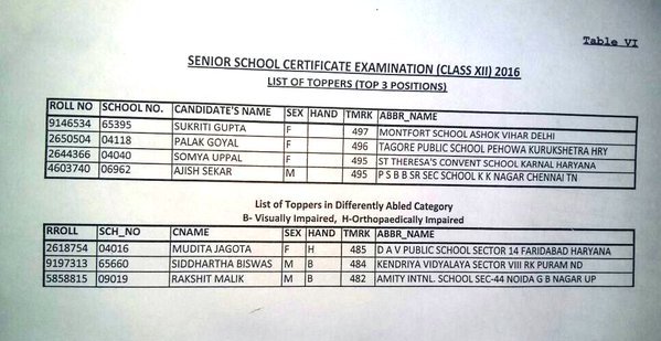 The Central Board of Secondary Education (CBSE) has declared results for Class XII this year and again this year also from 4 consecutive year the topper of CBSE Class 12th is from Delhi. The Delhi girl Sukriti Gupta from Montfort School in Ashok Vihar, the topper, scored 497 marks out of 500. Sukriti Gupta has scored 99.04% in the exam. The CBSE Merit List & Complete List of toppers 2016 is given below. This year a total of 10,67,900 candidates registered for the CBSE Class 12th exam.