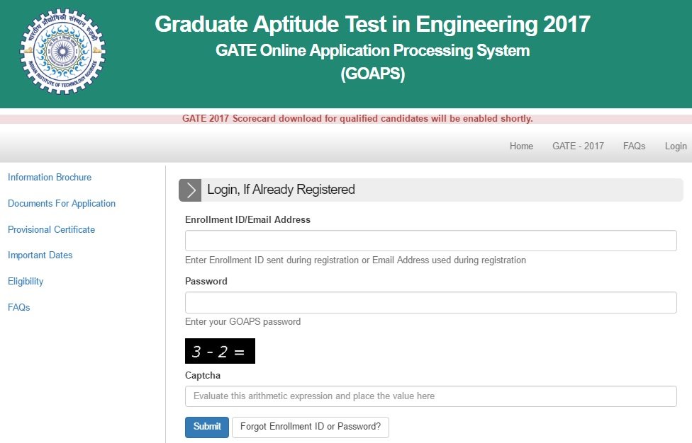 The official GATE 2017 Score Card can be downloaded from the GOAPS site between March 26, 2017 and May 31, 2017 by the qualified candidates only.