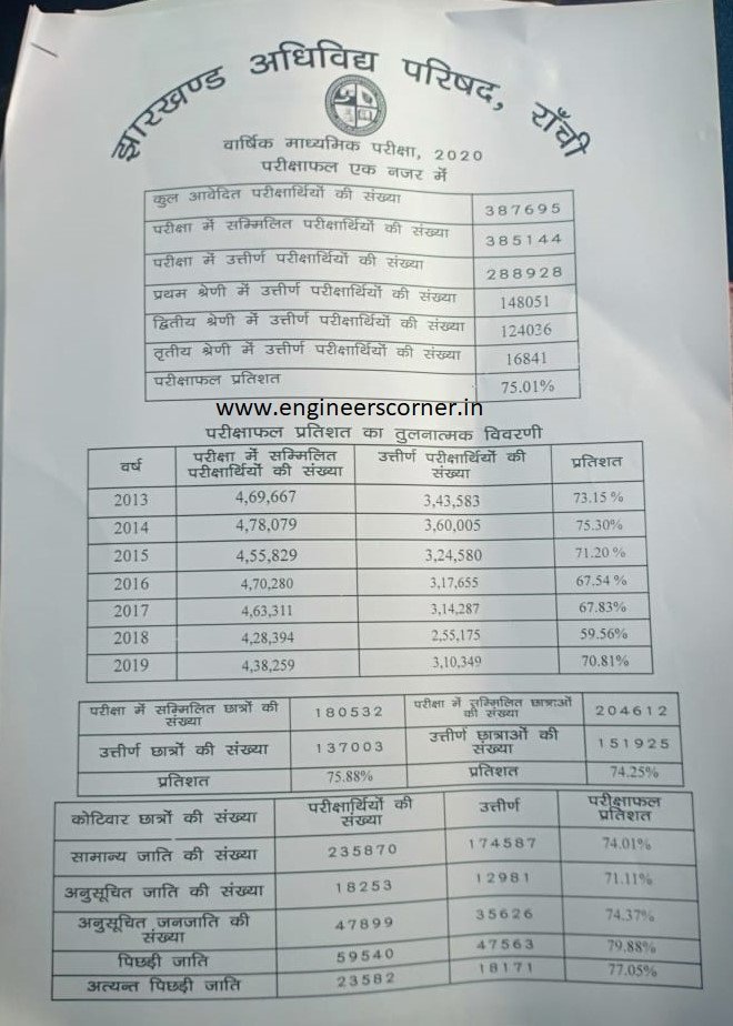 This year in JAC Class 10th result 2020 a total of 387695 lakh students who appeared in the examination with the overall pass percentage of 75.01 %. This year Koderma is 83.064% which is the highest among all districts of Jharkhand, and Ranchi with 80.52% secured 2nd rank. Ranchi is on 6th position. JAC students toppers list is not released by the board officially.