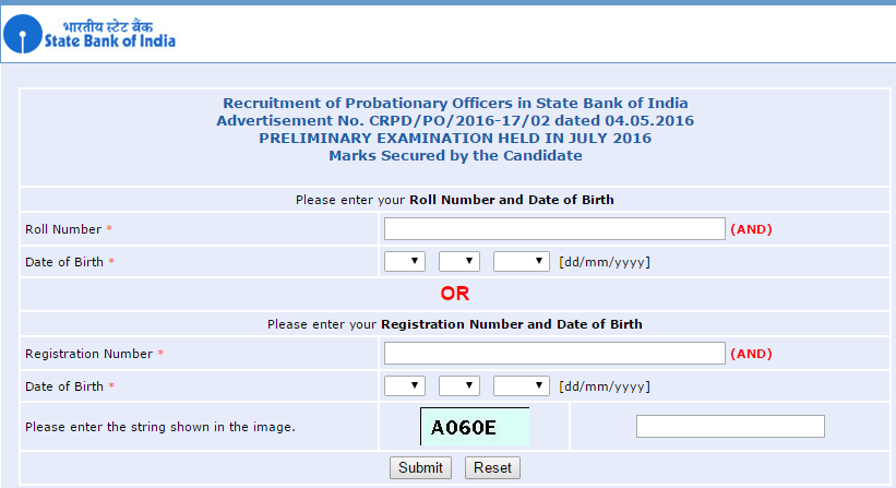 - A new tab will be open which says Recruitment of Probationary Officers in State Bank of India Advertisement No. CRPD/PO/2016-17/02 dated 04.05.2016 PRELIMINARY EXAMINATION HELD IN JULY 2016 Marks Secured by the Candidate.