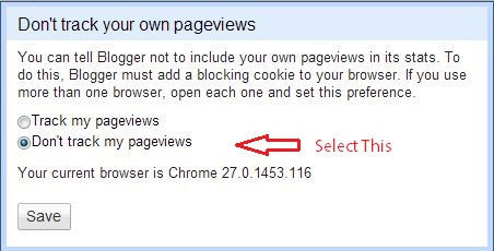 You will find an pop-up as shown below and then Click on “Don’t track my pageviews” as shown in the pic below “Select This” and than Click on “Save”.