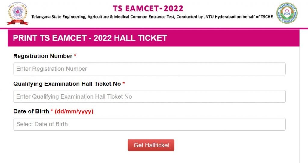 All candidates can now download their AP EAMCET-2022 hall ticket/admit card at eamcet.tsche.ac.in, The EAMCET-2022 Hall Ticket is now available for download on Telangana State Council of Higher Education (TSCHE) official website. This Year Jawaharlal Nehru Technological University Hyderabad (JNTUH) is conducting entrance examination of Telangana – Engineering, Agriculture and Medical Common Entrance Test (EAMCET) for this year 2022. EAMCET-2022 is going to be conducted on 14th July 2022 in Two Shifts. For Engineering (E) 10.00 A.M. to 1.00 P.M. & for Agriculture and Medical (AM) 2.30 P.M. to 5.30 P.M. Finally Candidates can download their much awaited EAMCET-2022 Hall Ticket. No Hall Ticket will be sent via Mail/Post or in person, Candidates are required to download from the below working link. https://eamcet.tsche.ac.in/TSEAMCET/EAMCET22_GetHT2022gkt.aspx