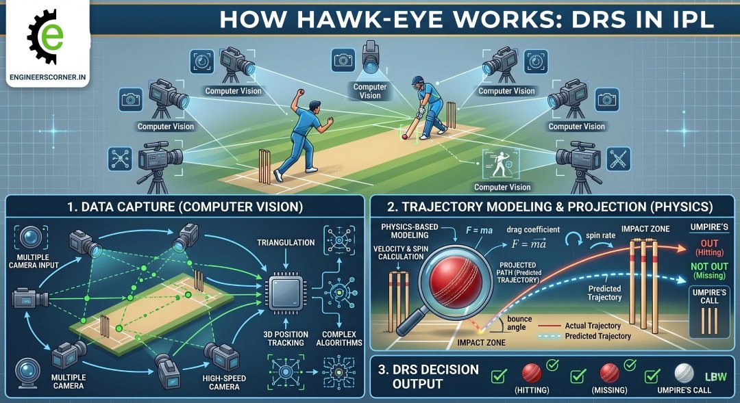 This article breaks down the complete engineering pipeline behind Hawk-Eye, the technology that powers DRS in every IPL match. If you study electronics, computer science, or mechanical engineering, you will recognize the concepts here from your own coursework, only applied at a scale of 140 km/h cricket balls and sold to broadcasters in 20 countries.