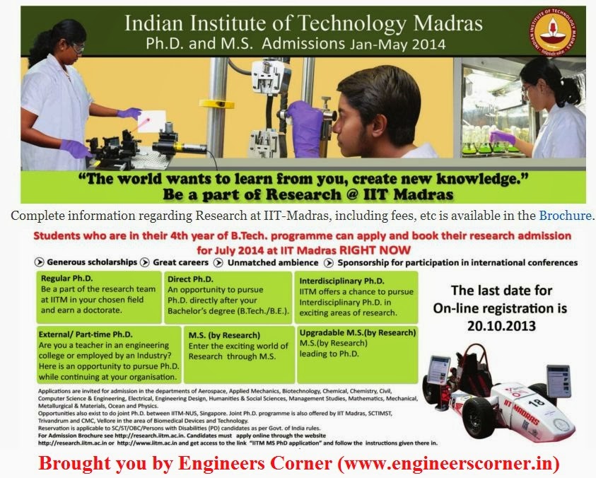 Want to be a Creative & Create a New Knowledge ? Then don’t wait Join Now & be a part of Research at IIT Madras. If You are looking for the Research Program then go for the IIT Madras. Yes, IIT Madras Invites Application for the Research Program i.e Ph.D & M.S. Program for the year Jan-May 2014. The Application Form is to be Filled Online. The hole details Regarding the Research @ IIT Madras is Given Below. Don’t let the Opportunity Go.
