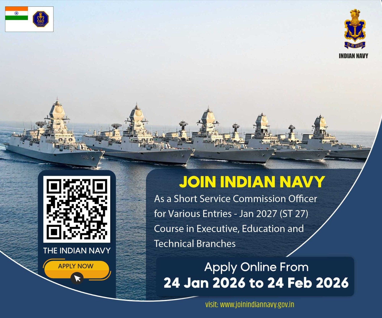 The Indian Navy has officially released the notification for Short Service Commission (SSC) Officer Recruitment – January 2027 (ST 27 Course). Eligible unmarried men and women can apply online for various Executive, Technical, and Education Branch entries.