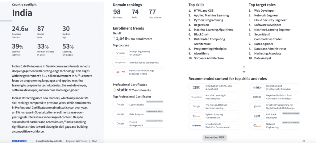 These rankings may evolve as India continues to attract new learners and diversify its educational focus. While enrollments in professional certificates have remained static year-over-year, there has been an 8% increase in specialization enrollments, indicating a broadening interest in varied content areas.