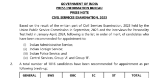Based on the result of the written part of Civil Services Examination, 2020 held by the Union Public Service Commission in January, 2021 and the interviews for Personality Test held in August-September, 2021, following is the list, in order of merit, of candidates who have been recommended for appointment to: