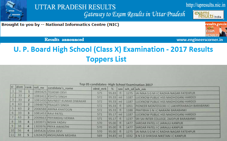 UP Board Class 10th Result is Declared at upresults.nic.in and UP board toppers list is now available. UP Board class 10th High School Toppers List 2017 is available now. UP Board class 10th Toppers list 2017 rank wise and district wise is given below. Tejaswi devi with 95.83% marks of Fatehpur district tops Class 10 exam.