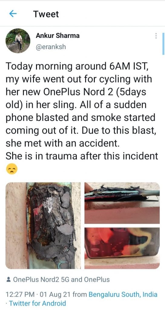 He further said in the tweet that due to this blast she met with an accident, She is trauma after this incident. However, the tweet is not available at the moment and has been deleted by the user Ankur Sharma. Please see below tweet snapshot. The OnePlus Nord 2 5G comes with MediaTek Helio 1200 processor and a 4500mAh battery which got exploded.