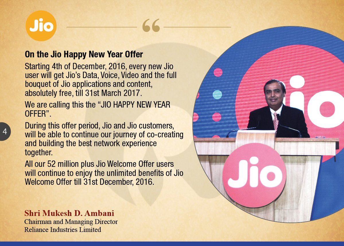 Reliance Jio has extended it’s free services until March 31, 2017. Reliance Jio led by Mukesh Ambani today made some very important announcement on Jio. Starting 4 December 2016, every new Jio user will get Jio’s Data, Voice, Video and the full bouquet of Jio applications absolutely FREE, till 31 March 2017, All existing Jio customers will get extended benefits of Jio Happy New Year offer till 31 March 2017 on current SIMs.