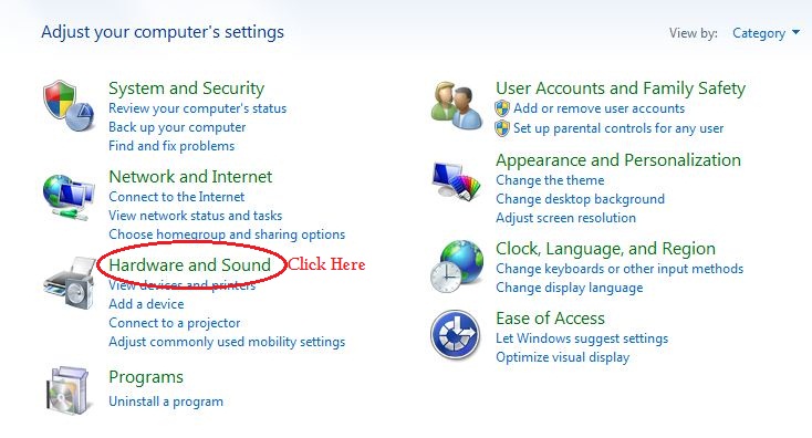 - After Control Panel in category View, Click on “Hardware and Sound“