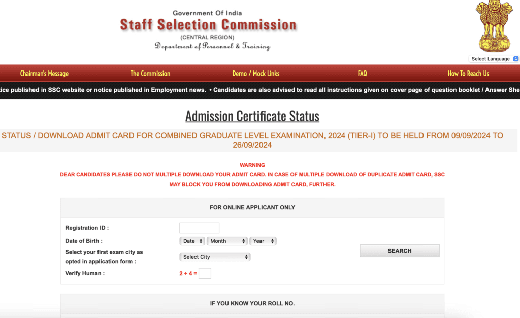 4. Login to Download: Click on the appropriate link to download the SSC CGL 2024 Tier 1 Admit Card, then enter your Registration Number, SSC-registered password, and captcha.