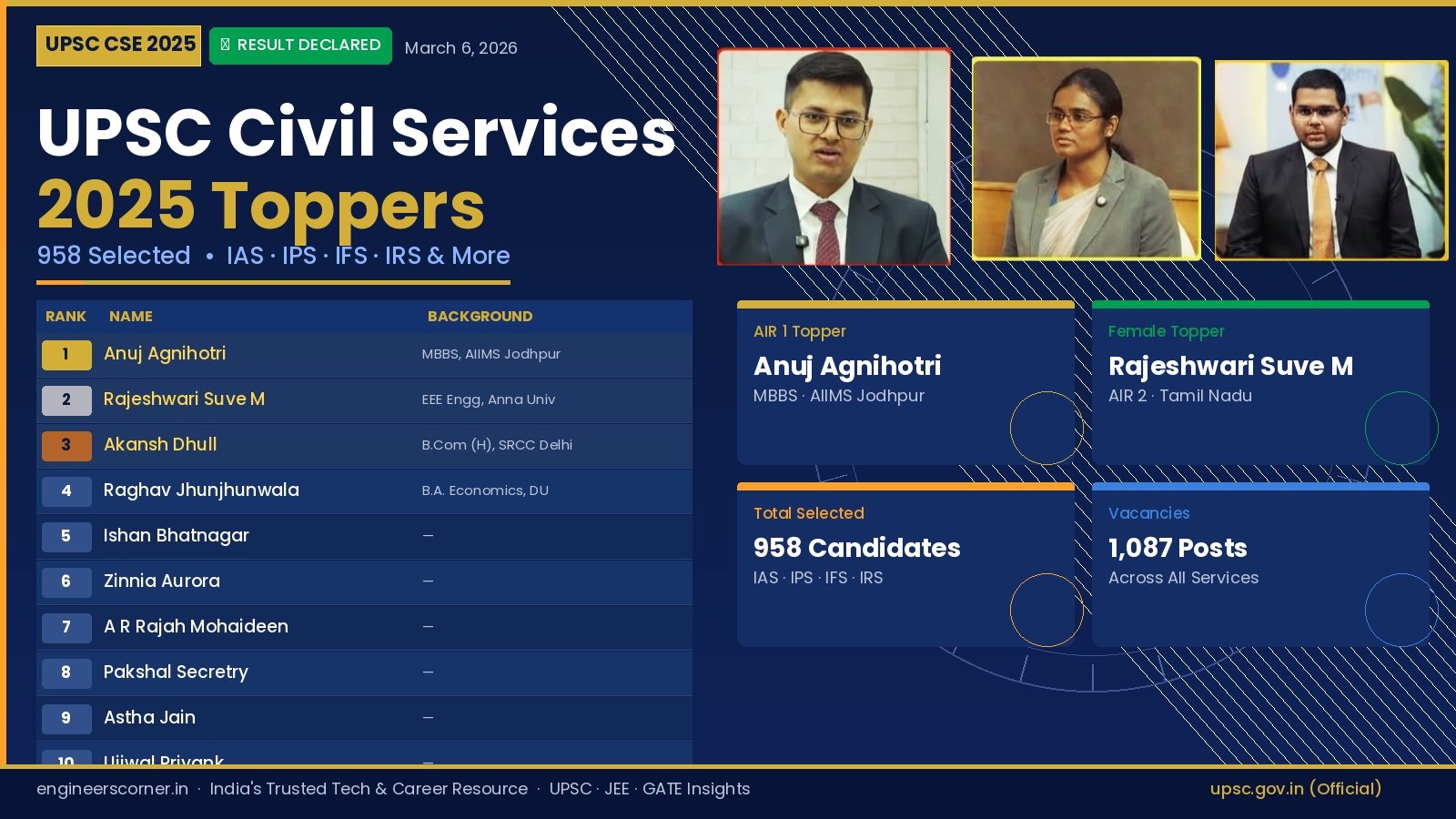 Quick Facts: Result Date: March 6, 2026 | Total Selected: 958 candidates | AIR 1: Anuj Agnihotri | Female Topper: Rajeshwari Suve M (AIR 2) | Marks release: within 15 days (by March 20, 2026)