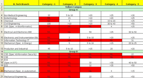 Vellore Campus: Bio-medical engineering: 81; Biotechnology: 158; Chemical Engineering: 86; Civil Engineering: 276; CSE (Bio-Informatics): 120; Electrical & Electronics Engineering 241; Electronics & Instrumentation Engineering 78; IT: 259; Mechanical Engineering (with specialization in chemical process engineering) 75; Mech. Engineering (Energy Engineering): 129; Mech. Engineering (Production Engineering) 74; CSE: nil; ECE: 618; Automobile Engineering: 49; Mech. Engineering: 577.