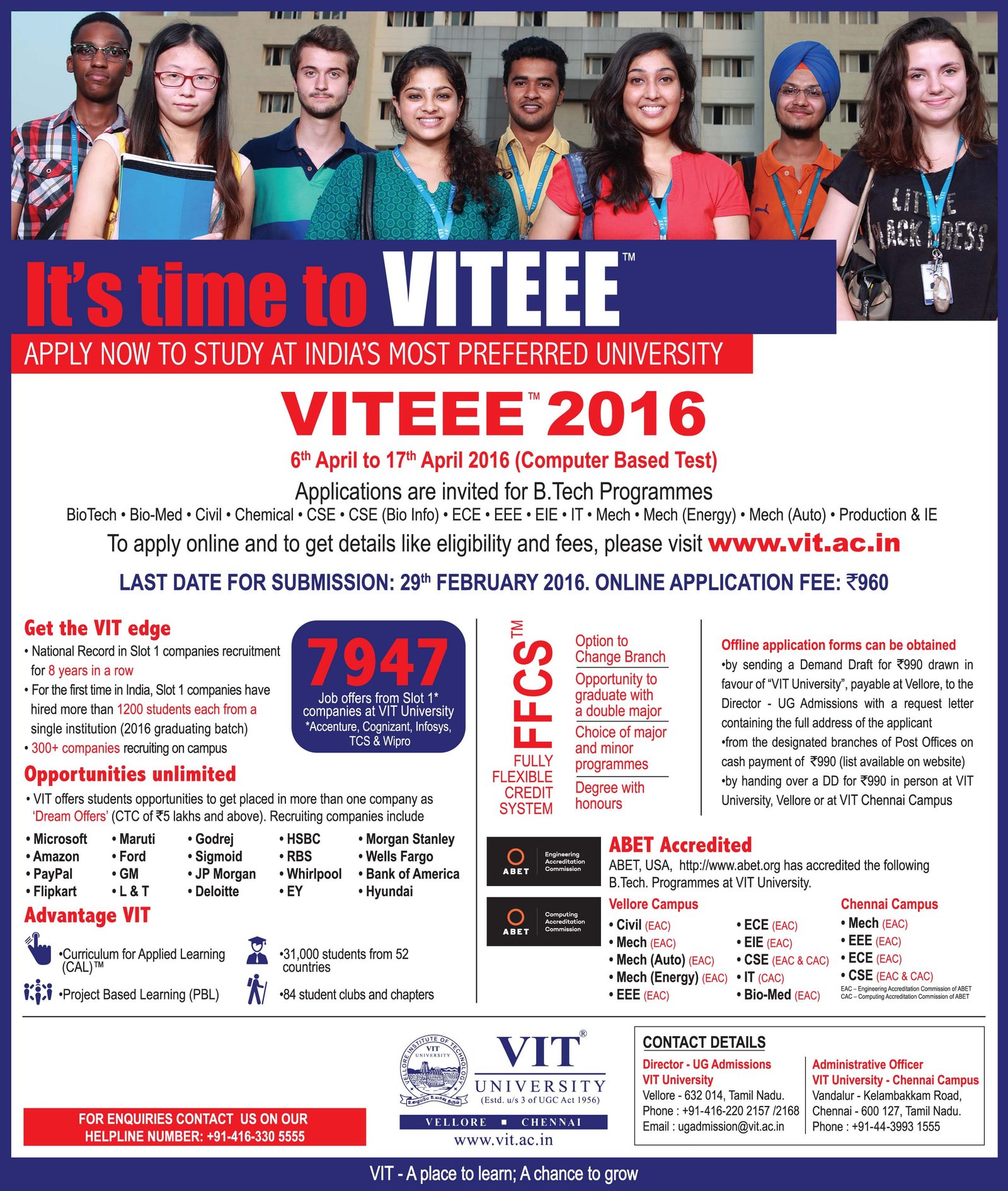 Vellore Institute of Technology (VIT) is one of the Best Private Engineering College of India regarding academics, faculty, Placements, Infrastructure, etc. that is the reason VIT University conducts VITEEE ( VITEEE pronounced “witty”) every year across India. This year also VIT University is conducting VIT Engineering Entrance Exam (VITEEE – 2016) and the Notification for VITEEE – 2016 is released by the University. This Year VITEEE – 2016 will be conducted in Computer Based Test (CBT) which is scheduled in April 2016 and candidates will have to make Slot Booking in online for the exam in the convenient date. Here are the Complete Details about the VIT Engineering Entrance Exam (VITEEE – 2016) Exam.